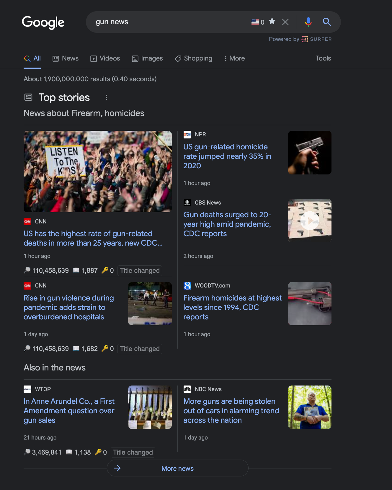 Take a look at this simple google search above for “gun news.” All the top stories which the search engine recommends show multiple sources essentially writing and talking about the same thing. On a less busy week for 2A news, the same google search would usually produce isolated incidents such as self-defense stories against robbers, wild animals, or different legislation regarding gun rights.